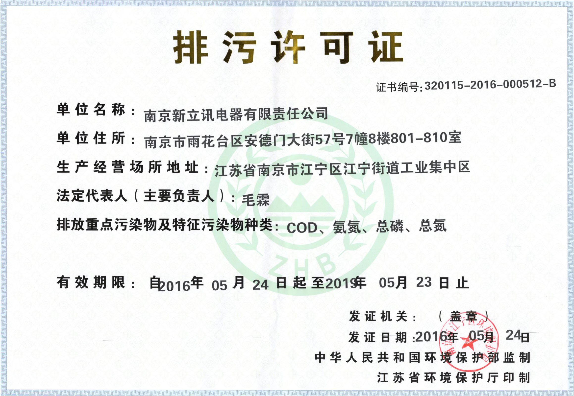 2016年5月24日,南京新立訊電器有限責(zé)任公司獲得江蘇省環(huán)境保護廳頒發(fā)的最新版排污許可證。南京新立訊電器有限責(zé)任公司成立以來,領(lǐng)導(dǎo)班子高度重視環(huán)境保護工作,多次就環(huán)保驗收及排污許可證的取得等事宜進行安排部署,極大地促進此項工作的完成。