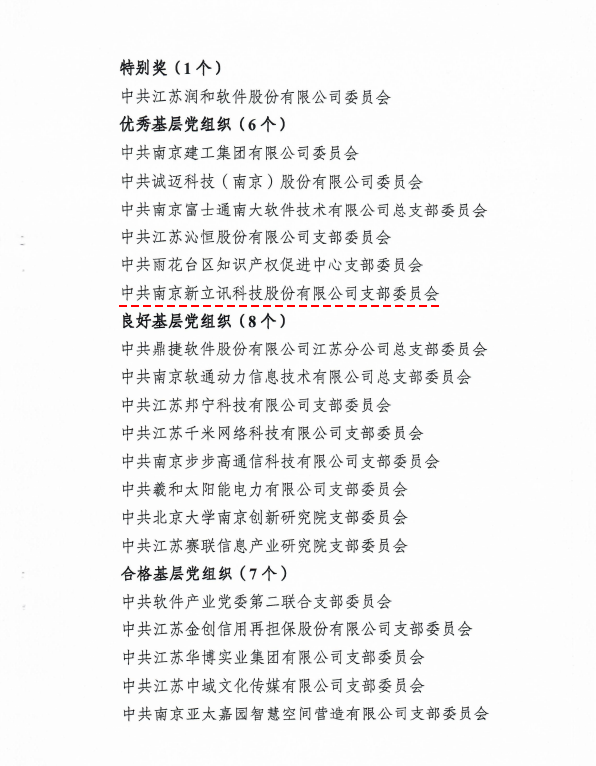2018年5月8日,根據(jù)《中國(南京)軟件谷軟件產(chǎn)業(yè)黨委關(guān)于2017年度非公企業(yè)黨組織考核結(jié)果的通知》,中共南京新立訊科技股份有限公司支部委員會(huì)榮獲“優(yōu)秀基層黨組織”榮譽(yù)稱號(hào)。