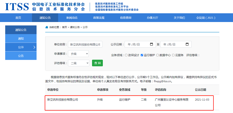 2021年11月初,經中國電子工業標準化技術協會信息技術服務分會專業評審,新立訊順利通過ITSS信息技術服務運行維護二級資質認證。
